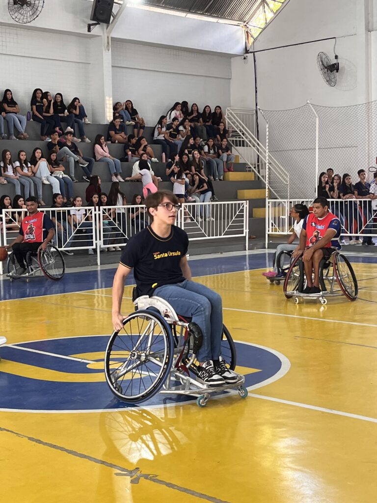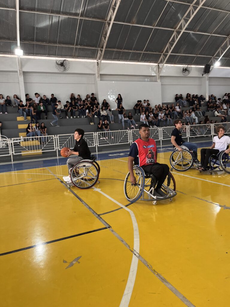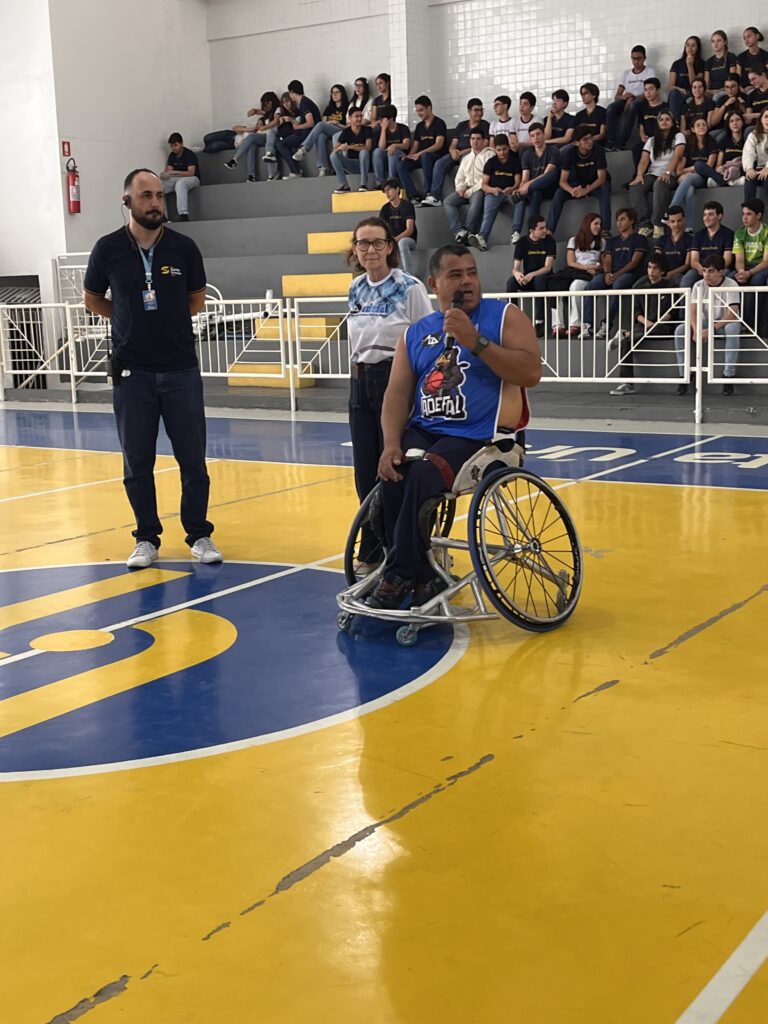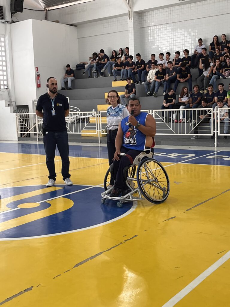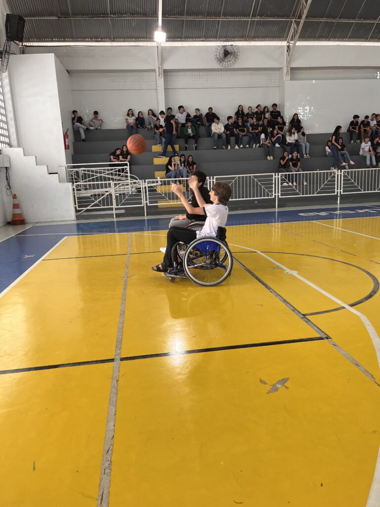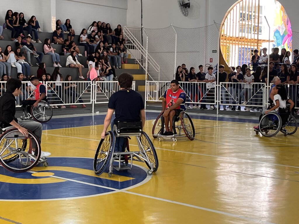 O momento foi marcado por uma vivência inclusiva e transformadora, que contou com a participação da equipe de basquete em cadeiras de rodas, proporcionando aos alunos a experiência de praticar um esporte adaptado e refletir sobre empatia, respeito e superação.